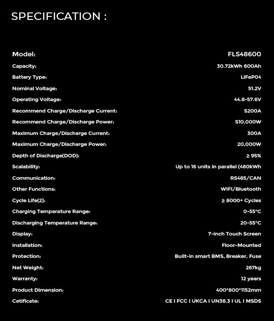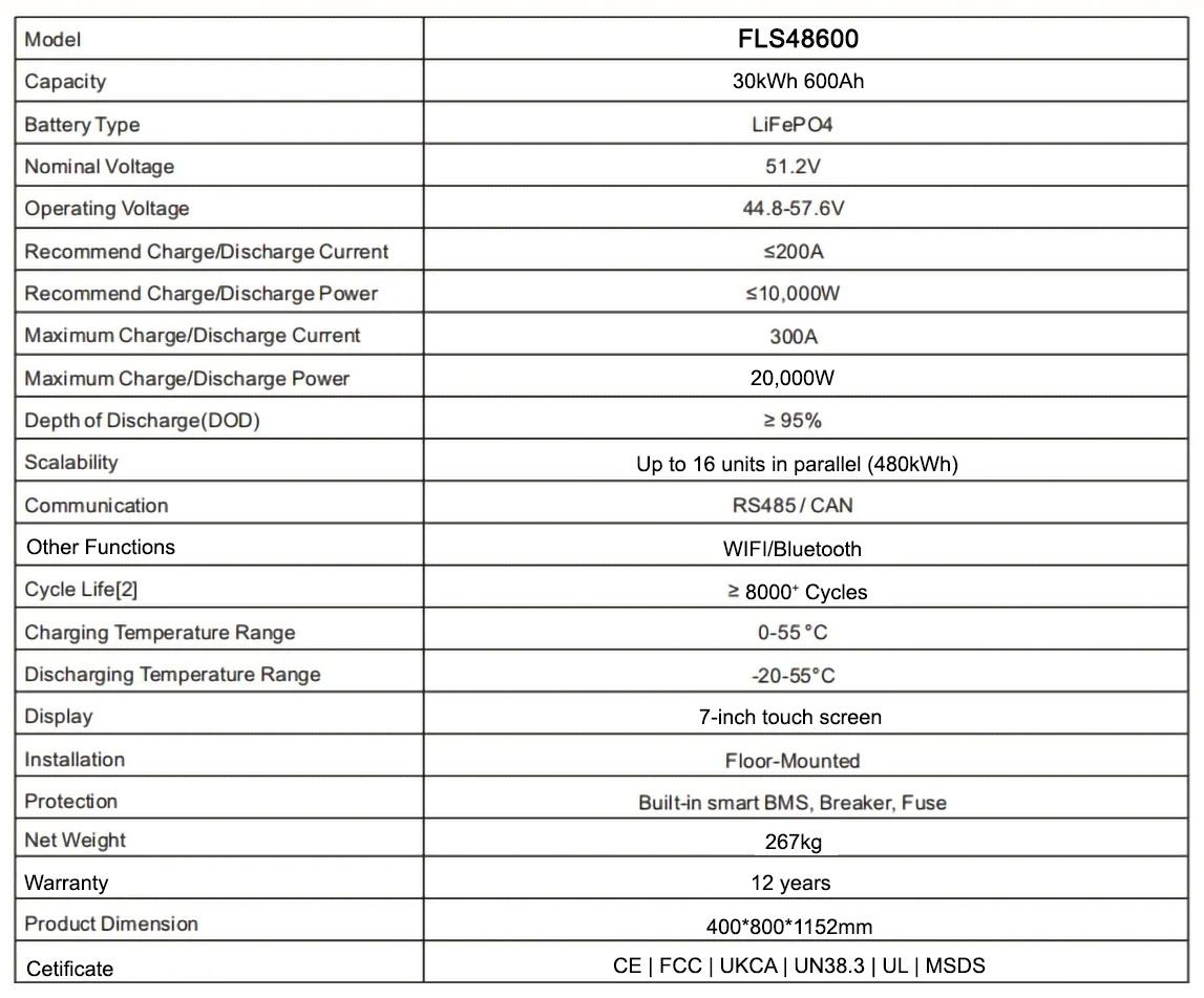 Batería LiFePO4 de 30.72kWh 51.2V 600Ah