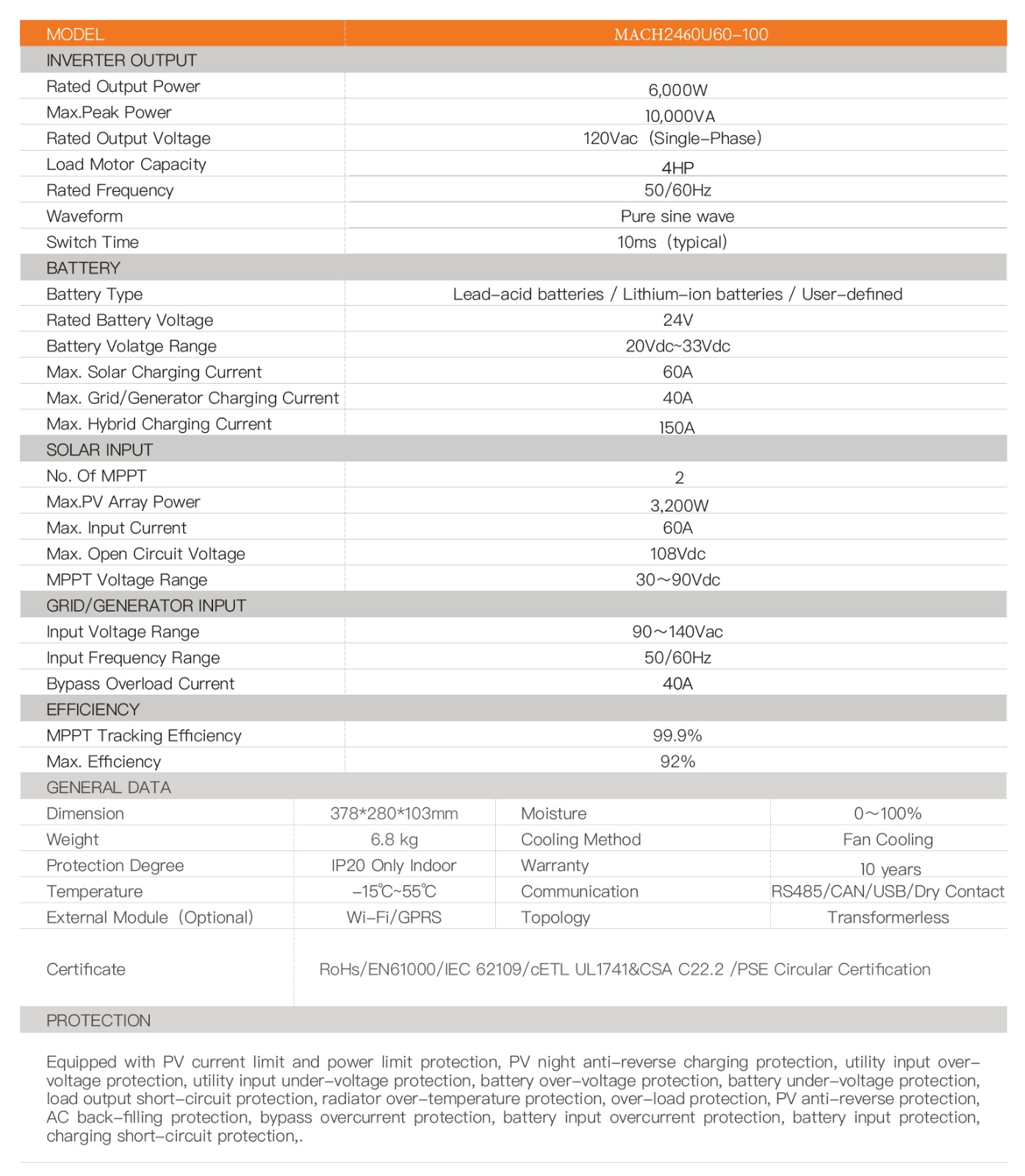 MACH-6 | 6kW | Grid-Tied | Inversor Híbrido | 24V | 2-MPPT