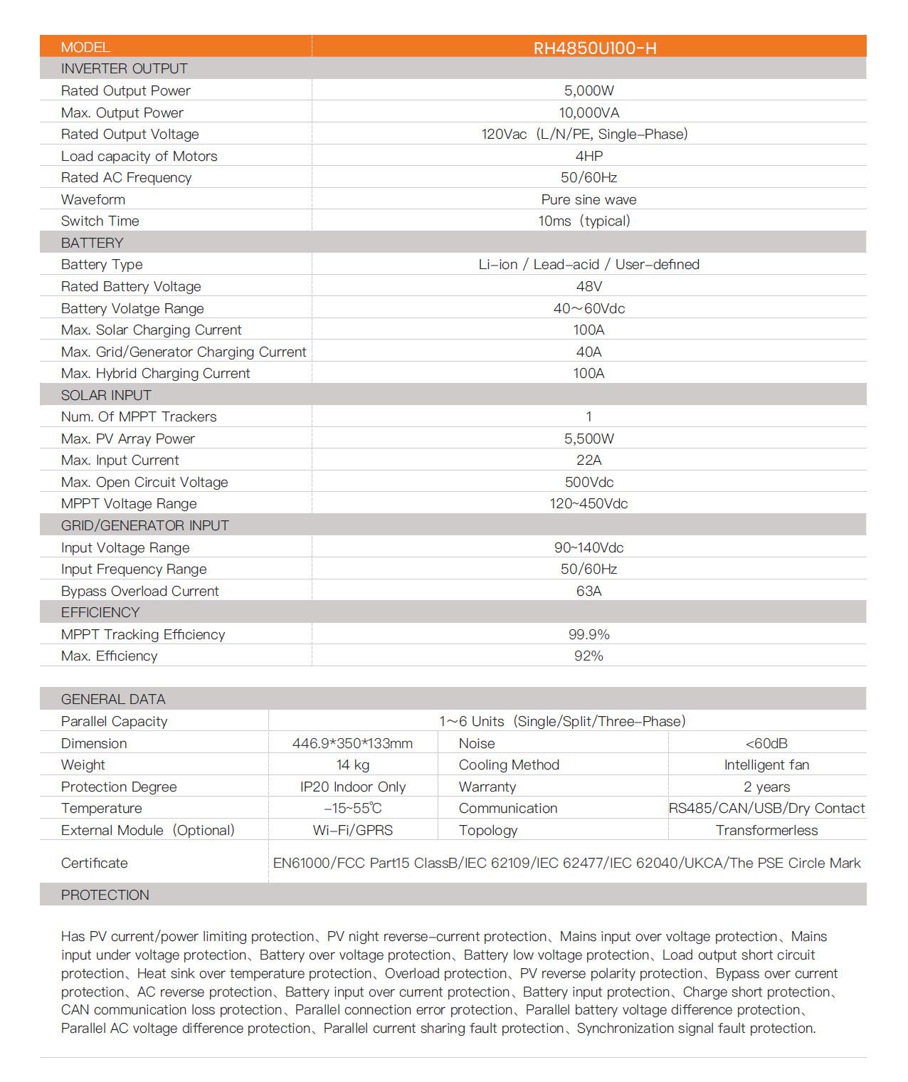 RHINO | 5kW | Grid-Tied | Inversor Híbrido | 48V | 1-MPPT