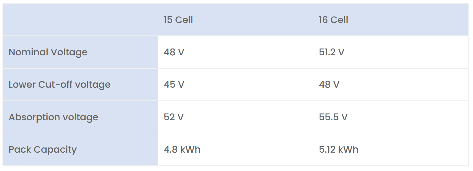 As shown, the total capacity of a 16-cell battery is more than a 15-cell battery, as is the nominal voltage which offers a small improvement in the efficiency at which the inverter can convert the DC to AC. While the values in the table are theoretical, it is not the same in practice, as the 15-cell battery packs recommend an operating voltage range that is often larger, thus placing more strain on the individual cells resulting in decreasing lifespans and performance. The performance of the packs also depends on the BMS, the quality of the cells, the capacity of the cells, and the cell pairing.
